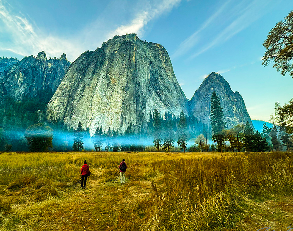 Great sky, good light etc. But the distortion from the wide angle lens mentioned also by Gaetan disturbs me - especially the person on the left who tilts very obviously. I'd use distort to pull him/her back to nearer upright. To start with I didn't think the trees were a problem - but having adjusted on left hand side for the photographer, they seemed more obvious... Have a look. You lose the impression of scale and vastness though which is a shame. In retrospect - several shots merged into a panorama might have been a better choice. Is that reason enough to return there? Looks a wonderful place! ;) |