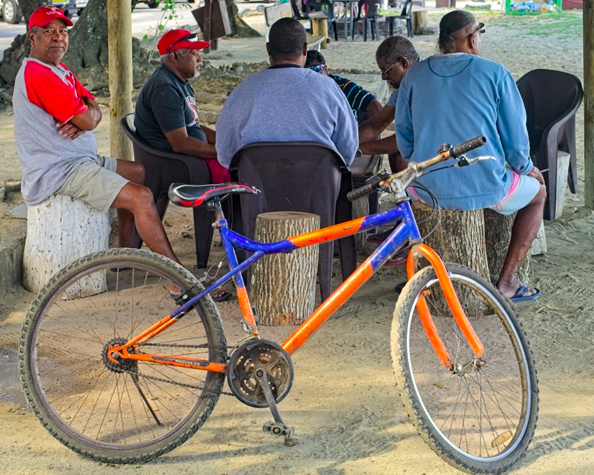 I really enjoyed this image - the matching shape of the group of men and the bike (alternative title: Six men and a bike?), and the similar colours. Because this is where the interest is for me, I'd crop in even tighter on this. Such a shame about the missing part of the bike wheel! |