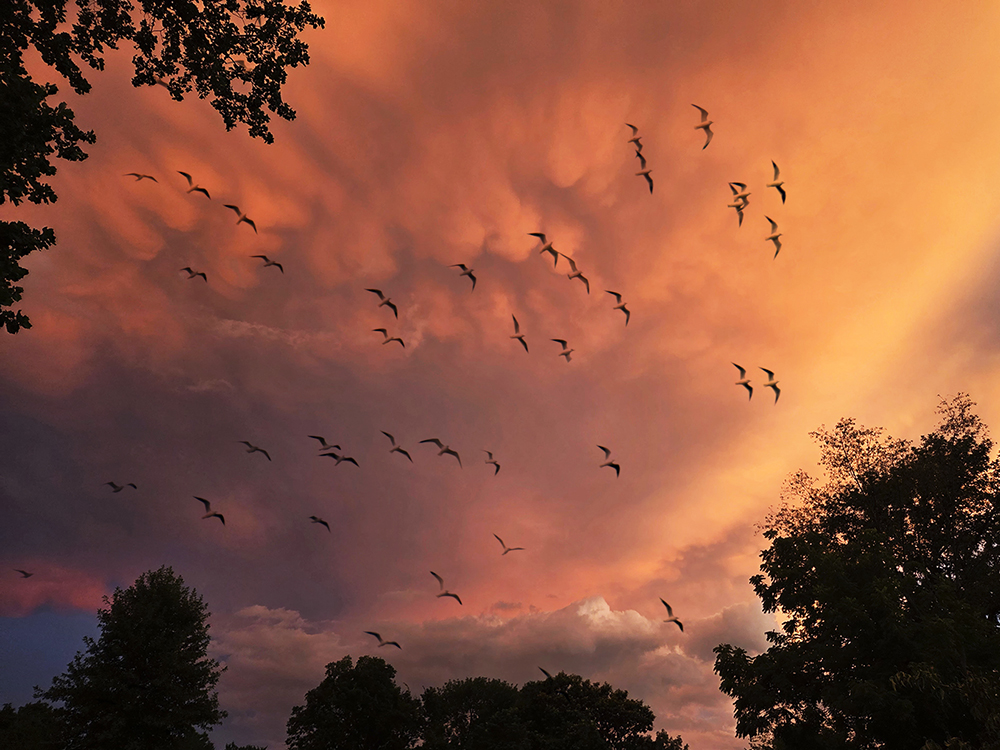 I love this sky - and have lived in places with similarly stunning sunsets! So I have gone even further with contrast - and have cropped away more of the trees to focus on a flock of birds which just happened to be passing... OK, not the best flock, but I do fancy the birds add drama and a subject to the sky, to add to the overall effect. Just a thought..... I also cropped out more of the trees as they then seemed to be just a border... |