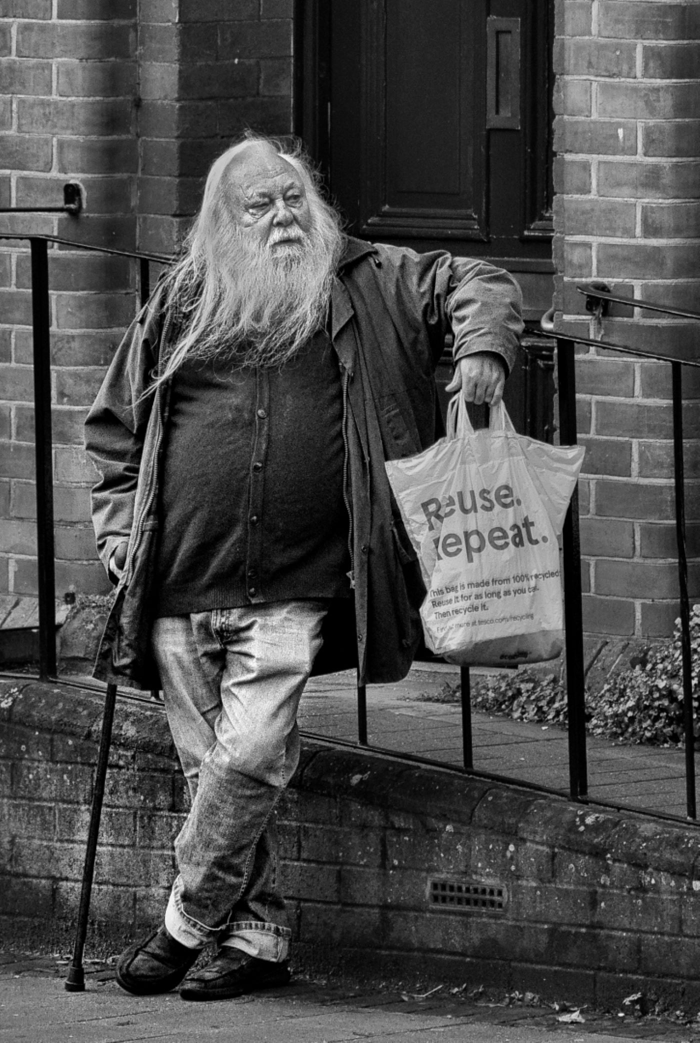 Very nice street photo. Good detail and it tells a story. I darkened the bag and his beard a little to see how it would look. |