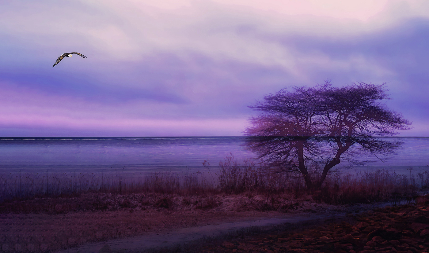 The eagle adds balance and interest. The sky above the tree line and the eagle seem too bright given the darkness of the water and foreground. Love the purple colors. Maybe add some magenta to the blue? |