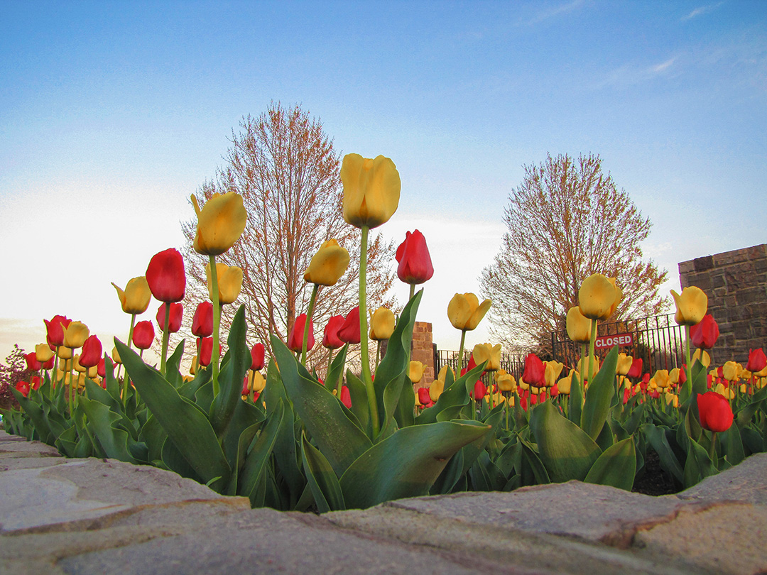 Carole, I see several things that work in this photo. The diagonal lines of the stonework and the angles of the green leaves give the photo a lot of upward energy, that complements the upward angle of the shot. The yellow and red colors in the tulips work well with the rusty color of the trees in the background, and the stonework has a reddish cast. The tulips are clearly the subject. I pulled a copy into Lightroom and pulled out a tiny bit of red and yellow and some of the blue; if you lower it any more I think those tulips lose some of their charm.