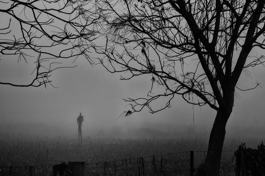 You definitely captured an eerie mood so nice job - having said that, I feel the dead branches or nest or whatever in the center of the image is a bit of an eye-grabber and keeps me from really exploring the image. And the forlorn local appears to be more of a corn stalk of some other form of dead vegetation but no matter, it suffices as a ghostly and ominous figure. In my VF I eliminated the eye-grabber and added a touch of vignette to keep the viewer's eye on the ghostly figure - would love to know your thought on my modifications - still terrific job, you created a most interesting image |