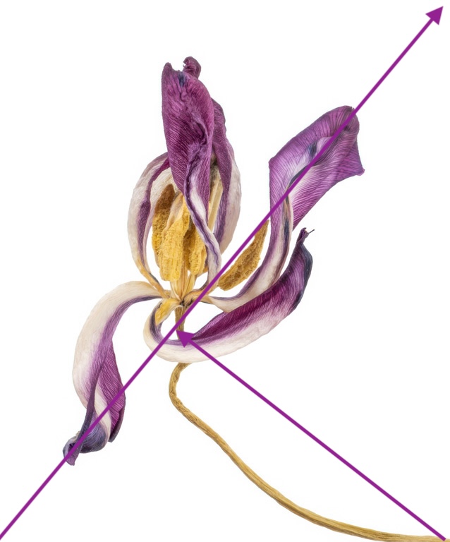 Detail, detail, detail - Judith you did an absolutely wonderful job with the detail in this image and your choice of using a decaying flower as the subject was, in my opinion, a great example of thinking outside the box - kudos, you did a really a nice job. In my visual feedback I've changed the composition and the crop and would like your thoughts. My rationale - I feel that as presented the trailing stem leads the viewer's eye away from the subject and out of the frame - by re-composing I was attempting to bring the viewer into the frame and to the subject. At the same time, by re-cropping I eliminated much of the negative space, which allows the viewer to focus a bit more on the subject. Lastly, and this may be subtle, but by re-orienting, I feel the image makes use of implied diagonal lines, (illustrated with purple arrows) that are usually pleasing versus the existing implied vertical and the horizonal lines. |