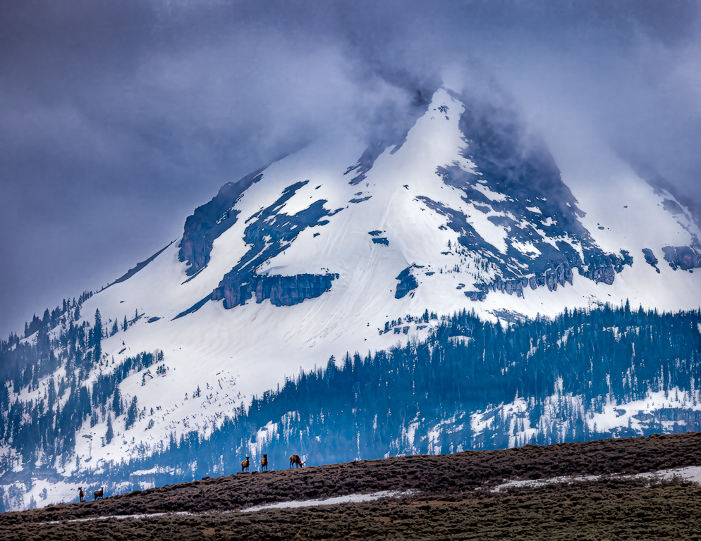 Gary - great shot of Yellowstone in the spring and kudos for keeping detail at both ends of the histogram - that's not easy in these situations but you certainly had the right equipment for it - the tonal range of the R5 is outstanding. Having said that, titles are important because they present a window to the creator's vision and ideas, while providing both context and information about the photograph for the viewer and ideally should reflect what the viewer sees in the frame so you might want to reconsider your title since the elk comprise about 1 or 2% of the frame. Compositionally, I feel the diagonal foreground is a real plus in this image and far more interesting than had it been purely horizonal, good eye. In my VF I offer an alternative, not necessarily better or more interesting but I just wanted that gorgeous mountain to pop a bit more by bringing out a tad more detail. Excellent image. |