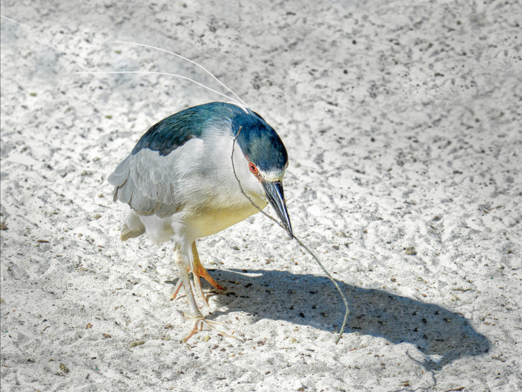 Tom, the bird pops well against the sandy background and I think the long shadow adds depth and a bit of drama - nice time of day. While not great action there is a sense of curiosity in the bird, and I can infer nest building behavior. I think for the perspective of shooting down on a subject you did very well - although I'm a believer that eye level bird shots are usually the most interesting. Nonetheless, I really like how you captured catchlight All in all, I find the image visually interesting and aesthetically pleasing. You might consider flipping in post so the subject's movement is from left to right. |