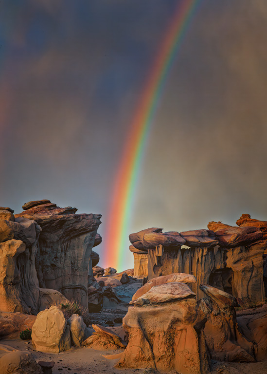 November might be a better time to go - early June is still spring out west and frankly I don't recall ever having experienced such diverse weather in one afternoon in my life. it was sunny when I left Farmington, by the time I got off the highway the clouds started forming. When we started our trek it began to thunder off in the distance, which quickly turned into a full blown sand storm - two other people who were there had the cameras sand blasted - literally and destroyed their lenses. Wind must have been 60 mph and had to take cover where there's no cover so I wedged in between some rocks - then it began to rain, then lightning but there was still blowing sand so I didn't dare take my camera out of its bag - by the time the storm had passed the light was pretty much gone. Here's one bit of advice - if you're going to shoot the Alien Throne (attached here) DO NOT SET YOUR CAMERA BAG DOWN AND WALK AROUND LOOKING FOR YOUR COMPOSITION - you may never find it again. It's a warren like I've never seen so keep you camera bag with you. It took me over half an hour to find it and I thought I had only walked a few steps. One more suggestion bring a wide angle and get LOW when you shoot the Throne itself - I did not and didn't get the shot I wish I had - in the attached the light was changing so rapidly that with this shot I simply moved the vibrance slider in LrC close to zero and left the sky alone - I wanted to give it a foreboding feel, i.e. "Where Demons, Goblins and Gargoyles Lurk" - Best of luck |