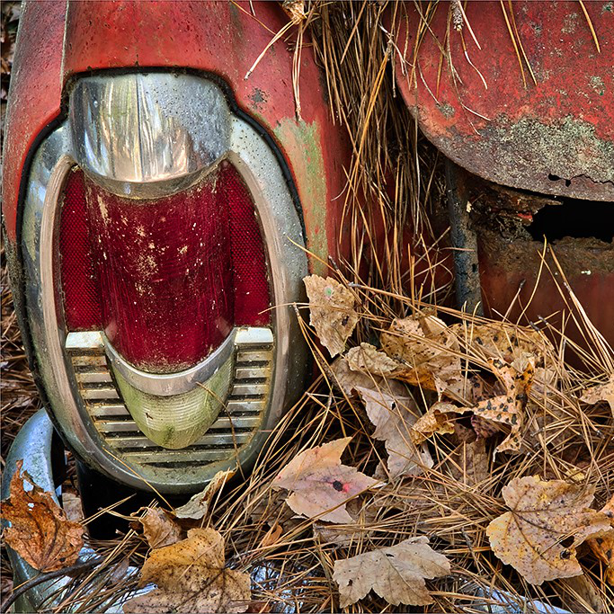 It is an interesting picture, especially with the enhanced colors (I love rusty and strong colors!). I like the mixture of dead leaves and old (dead?) car. I don't mind the bumper in the composition. I try to understand why you have second thoughts on this picture, and I think that's because it's not balanced. There is not much on the right to counterweigh the strong, heavy, element of the light on the left. Try to crop it from the right to make it a square image (see results) and see if you like it better. Also, you can remove the leaf on the grid of the light. |