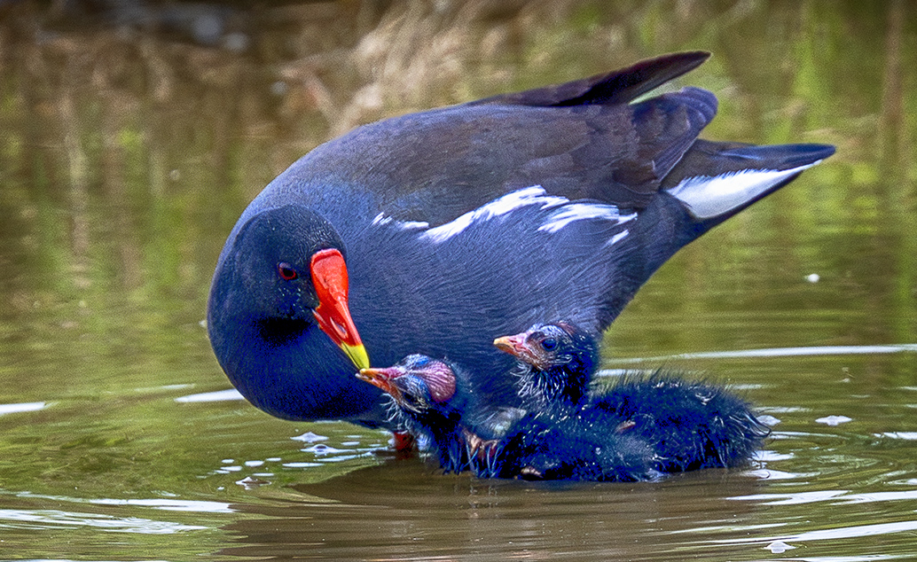 I don't have much to add to this beautiful photo. You captured the mother at the precise moment when she is feeding her chicks. The colors are outstanding. I like the reflections but wonder whether cropping from the bottom (and eliminating them) wouldn't render a better (not so square) composition (see one option) |