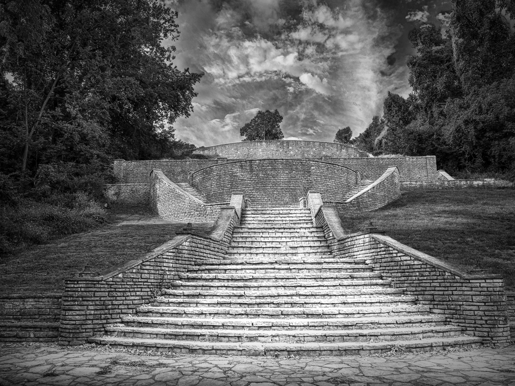 Emil, I like how you captured this image and the processing you did to the sky. To me what was interesting in the image is how the clouds form an arch that mimics the stone walls in the foreground. I could see myself setting up the camera as you did. As Pete mentioned in his comments, my eye does not follow up the stair to the tree in the center and the clouds which were I think you were guiding to viewer. Similar to Pete, I tried to create more contrasting areas in the image by darkening the vegetation and lightening the architecture in image. I further lightened the stairs to guide the viewer toward the tree in the center. I also had a vignette to further focus the viewer's attention. |