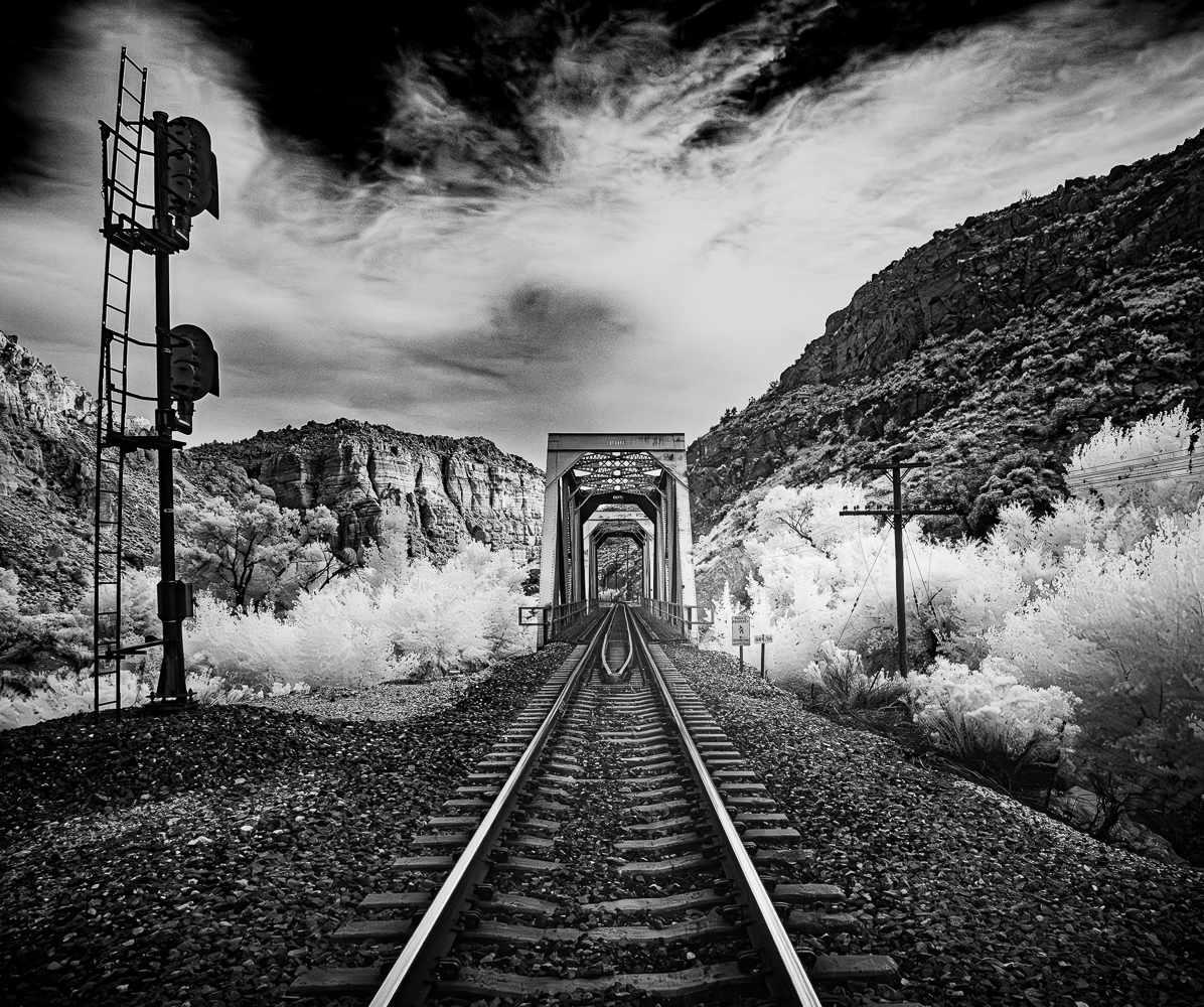 Hi Everyone, This is my first image posted to the group. This infrared image is of the bridge over the Meadow Valley Wash south of Caliente, NV in the high Mojave desert. I really enjoy the high contrast produced by infrared, prefect for shooting after golden hour ends and the scene turns to harsh shadows. Camera: Olympus EM-1 II converted to full spectrum with an 850nm filter and 12-100 Olympus f/4 lens. Details: 1/60 sec, 12mm (24mm FF equivalent), f4.5, ISO 1600. I processed it in Lightroom with basic tools, at 850nm images are pretty much B&W already. |