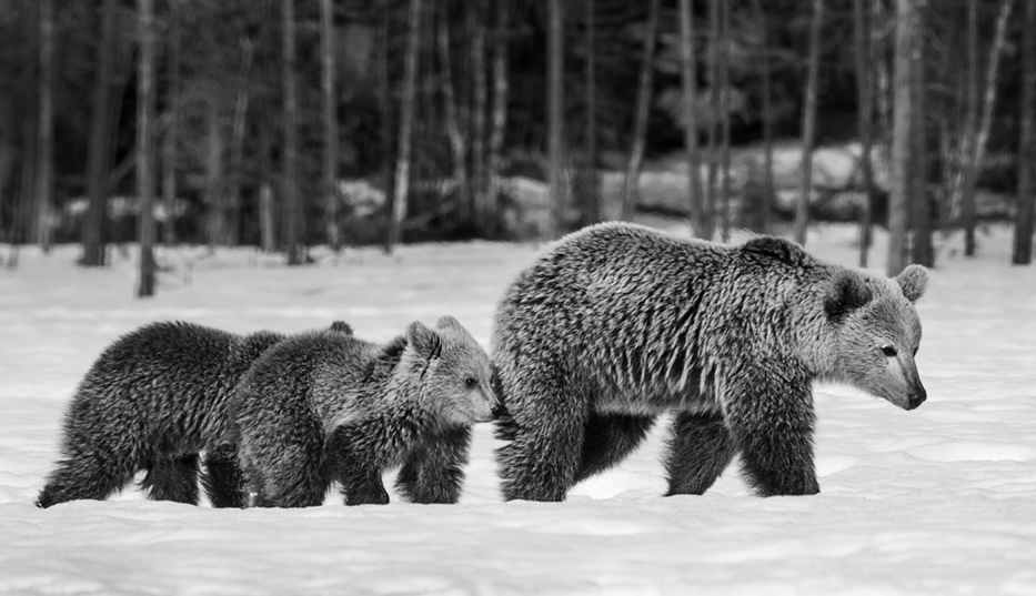 The camp sounds like an interesting experience, albeit with lots of tricky photography conditions. Like Tom, I think I prefer the color image here. However, in both images, I am distracted by the softly focused ridge of snow in the foreground. I tried cropping it out, darkening the background trees, and sharpening only the bears. Perhaps I sharpened them a bit too much, but you can see what you think. I also tried brightening the eyes/face a little bit. |