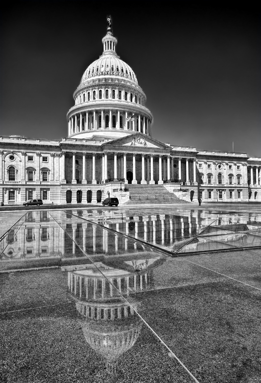 Silver Effects didn't show a particular problem, but I've tried adding some contrast to the building. I also darkened the sky some more, but had to do it separately, or it added too much noise and streaking. Does this help, or is it too much? The reflection is not water, but rather glass and marble. There is an underground annex on the north side of the capitol, and it has large glass skylights in the ceiling. |