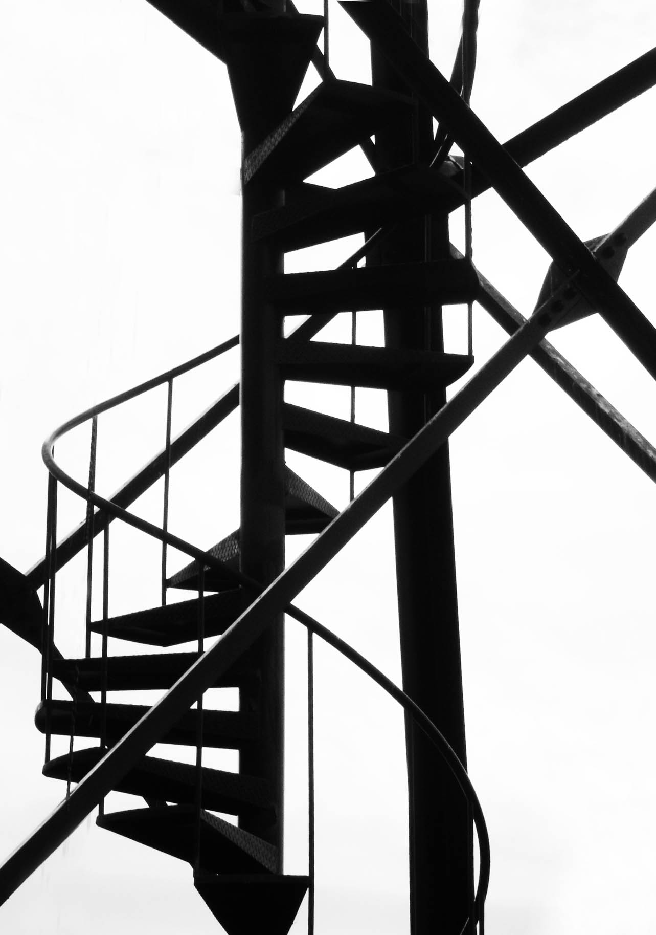 Since it seems to me that this photo is more about shape and design of the stairs and surrounding structure than a physical location per se, I think I prefer the edit Tom did eliminating the clouds. I experimented with some cropping and cloning out of some of the extra supports (assuming you are not entering it in a competition where cloning or removing elements is prohibited, of course). I think it may still be a little too busy for my own personal tastes, but you can see what you think. |