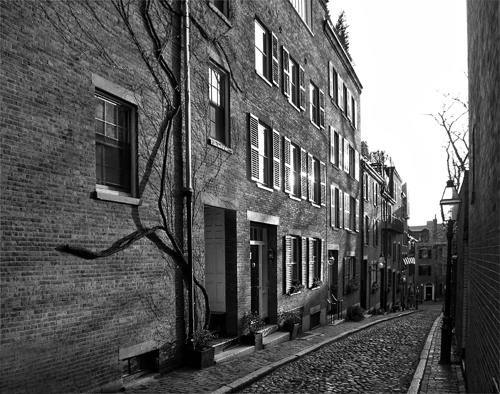The row house architecture on the East Coast is so interesting to me. We don't have much of anything like it in Texas or out West. I like the reflections of the late afternoon light on the windows and shutters. I know you like dark shadows, so you may not want to follow my suggestion about bringing up the shadows here, but part of what I really like about this image is the incredible texture in the brickwork of the buildings and the cobblestones on the street. It seemed to me that the brighter shadows better emphasized all that texture, especially when I eliminated the window on the lower left. I also added a touch of Topaz detail extractor. What do you think? |