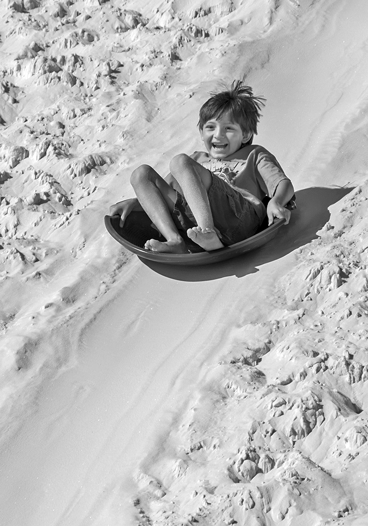 He looks like he is having lots of fun. I, too, like you composition and choice of a photo with your subject in the sun to avoid his face being lost in the shadows. I tried adjusting the shadows/highlights contrast a little bit. It seems to me that it helped to make the image brighter, but you can see what you think.