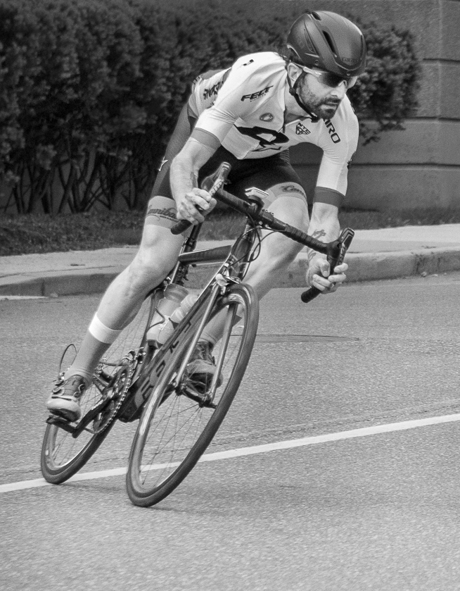 I agree that you did a nice job of timing this image to capture the rider in a flattering body position as he is making the turn. As others already commented, I, too, felt the monochrome image would benefit from being brighter. I tried adjusting it quickly with shadows/highlights, then selecting out and darkening the wall and bushes in the background. What do you think? Did that help, or is it too bright now? |