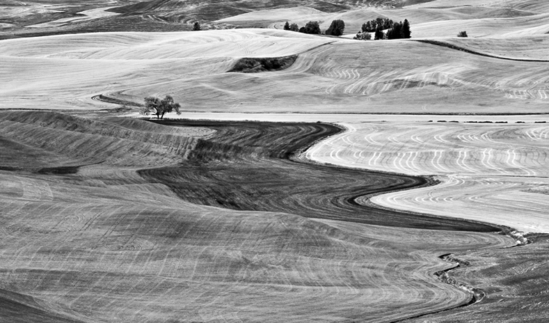 The Palouse is a photogenic area, although certainly more so during the spring than the late summer and early autumn, I would imagine. Although your image does a good job of conveying the vastness of the landscape, I am bothered by the location of the road bisecting the image so near the center. It almost seems to me that I am looking at two separate panoramic images, which might be an interesting thing to try with this image. I also tried cropping from the top and left sides and increasing the shadow and highlight contrast to add more emphasis to the lines and contrast of the dark and light areas. Of course, since you received an award with it as is, you may prefer not to change it. |