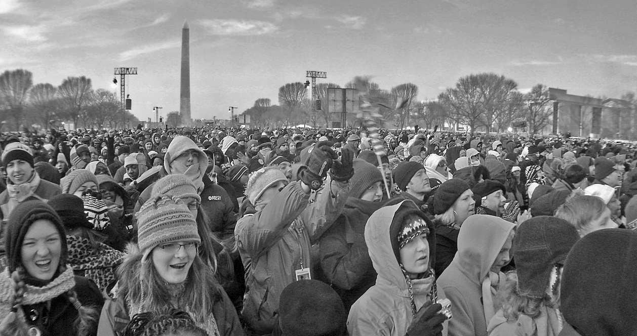 What an amazing opportunity to be at this historic inauguration. I know it was cold, but find the child in the front center part of the image, whose face cannot be seen at all since it is completely covered, to be a bit awkward. Thus, I tried cropping the image into a panorama. I also brightened the shadows because I wanted to see more details in all those intriguing and hopeful faces. Does that work? |