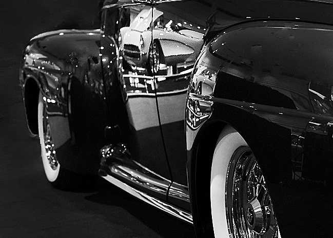 I enjoy classic cars, but like you, struggle to photograph at auto shows with all their distractions. As others already mentioned, converting this image to monochrome was a good idea. The way you've presented it works, but since you mentioned being attracted to the reflection of the other car, I decided to try tighter cropping to see if that would put more emphasis on the reflection. That did seem to reduce the dominance of the rear wheel and dark space on the lower left side of the image for me, but others may feel it is too tight now. You can see what you think. |