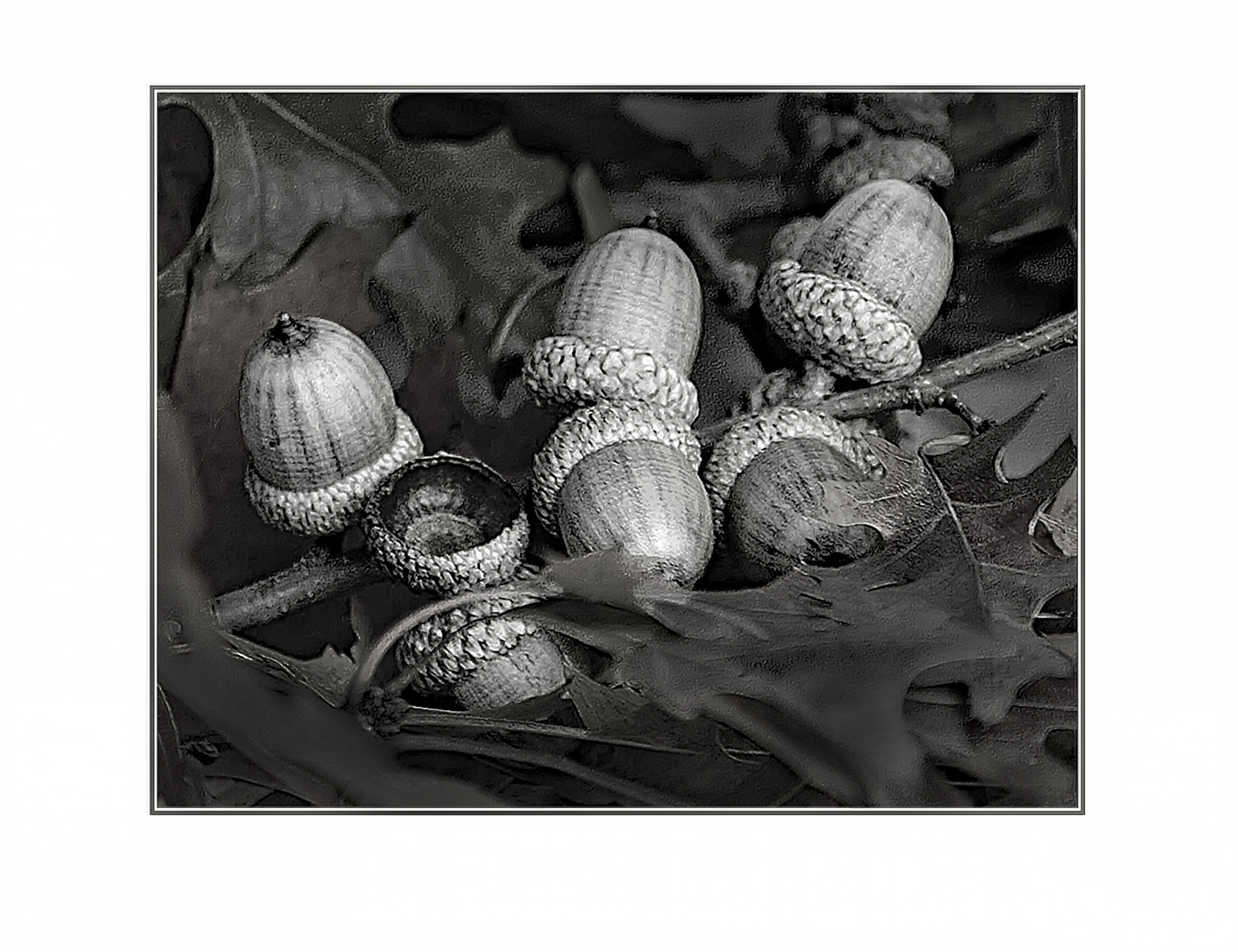 I, too, like the diagonal line of the acorns, but as others already mentioned, some of the surrounding leaves are distracting, particularly the one with the bright spot on the lower right. You mentioned that you use the contrast tool, so I tried a selection on some of the leaves using it and the brightness reduction slider. However, I found that I also had to use the dodge tool to darken the bright spot on the foreground leaf. I possibly created too much of a vignette effect for your and others' taste, but you can see what you think. |