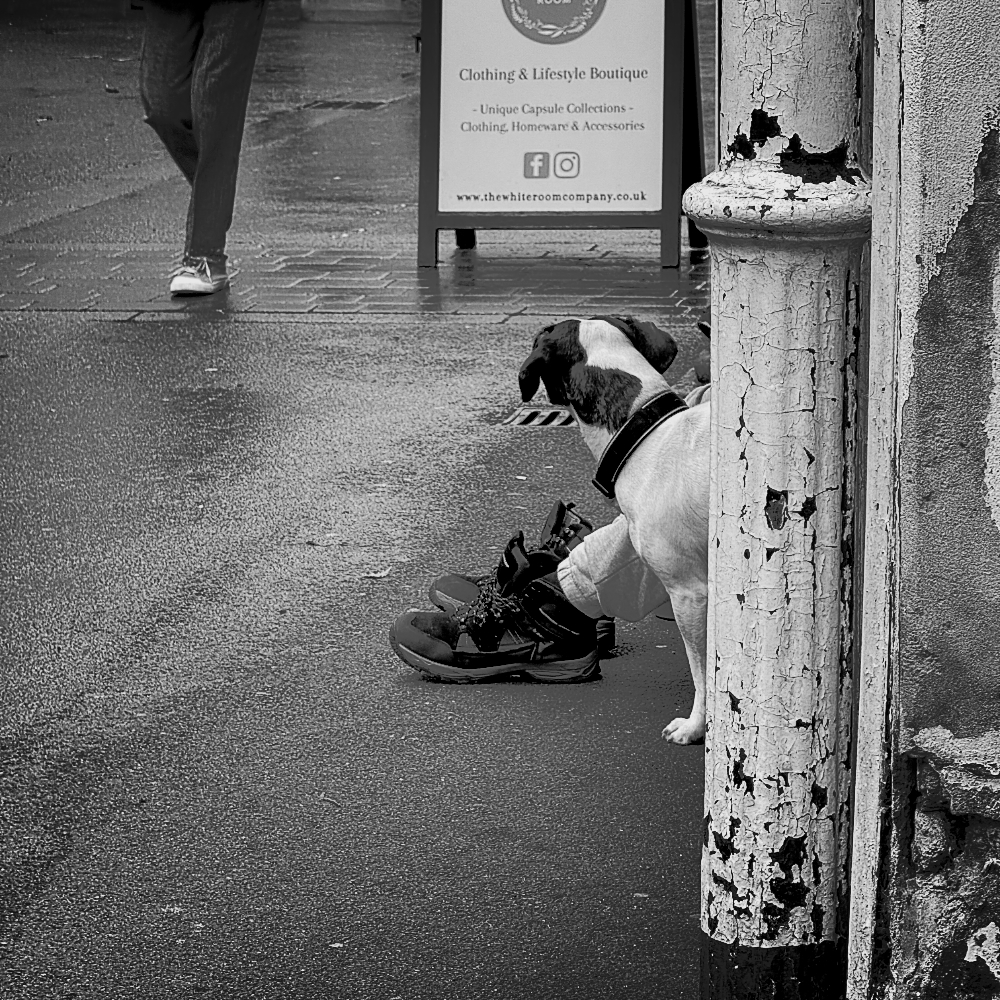 This is not the first picture you have posted that has two distinct halves that compliment each other and also make a whole. The negative space of the concrete wall (which is not featureless) pushes the eye to the mysterious leg and then the imagination can get to work. You have a good eye, as I've said before, and again the toning suits the image.