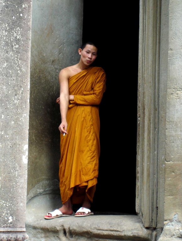 Nice shot, photographically and culturally! When my wife and I traveled to Angkor Wat, we learned that the time in the monastery for young men was part of their education, and could be for as little as a year or even a month. Evidently, some took their time "inside" not too seriously--see the attached shot I got out behind a monastery rear door. |