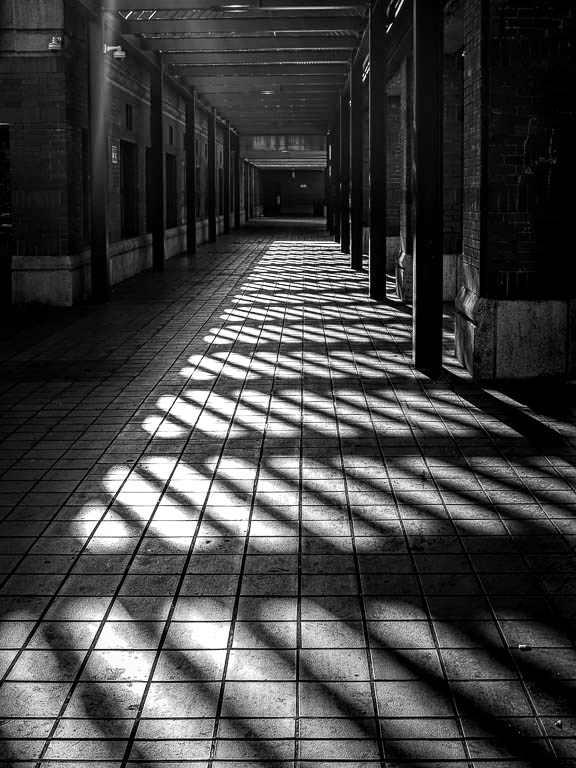 Hi Bob, I am visiting from Monochrome Group 32. I absolutely love architectural shots with no people or focal point there. I think they express emptiness or loneliness. The lights and darks are very interesting in this image. What was the light source that cast those great patterns on the floor--a ceiling of glass panels? I tried converting to monochrome, as a sample for discussion. What do you think? |