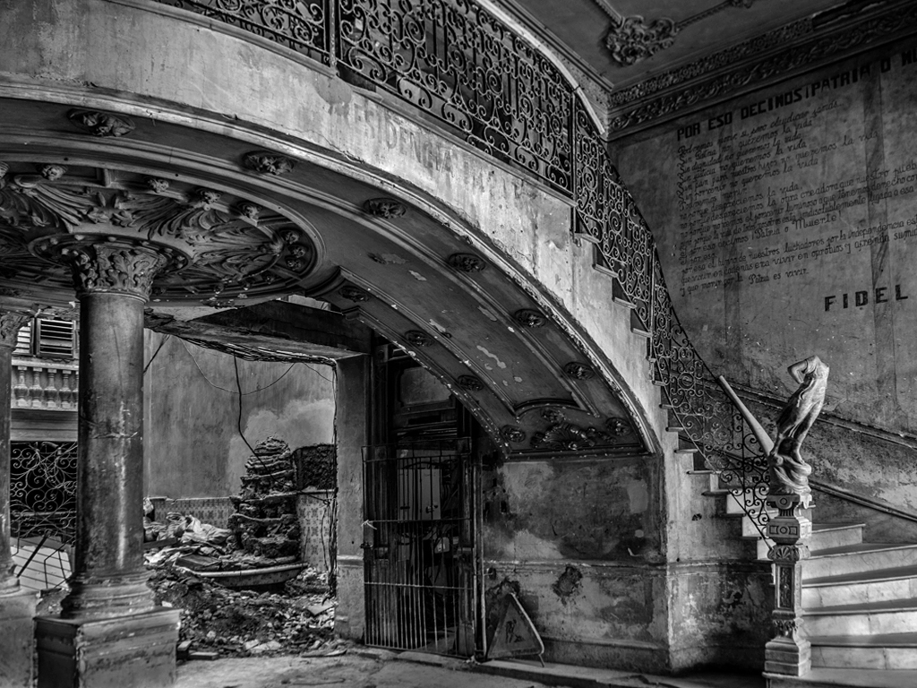 Hi Lynne, I am visiting from Monochrome Group 32. How I wish I had made a trip to Cuba recently--so many of the DD members are showing great images from their travels there. This is a captivating image--especially the headless statue on the bannister--and almost monochrome, so I tried it all the way. I straightened the verticals a bit, adjusted overall brightness and contrast to taste, and added a tiny bit of sharpening. How do you like it in monochrome? |