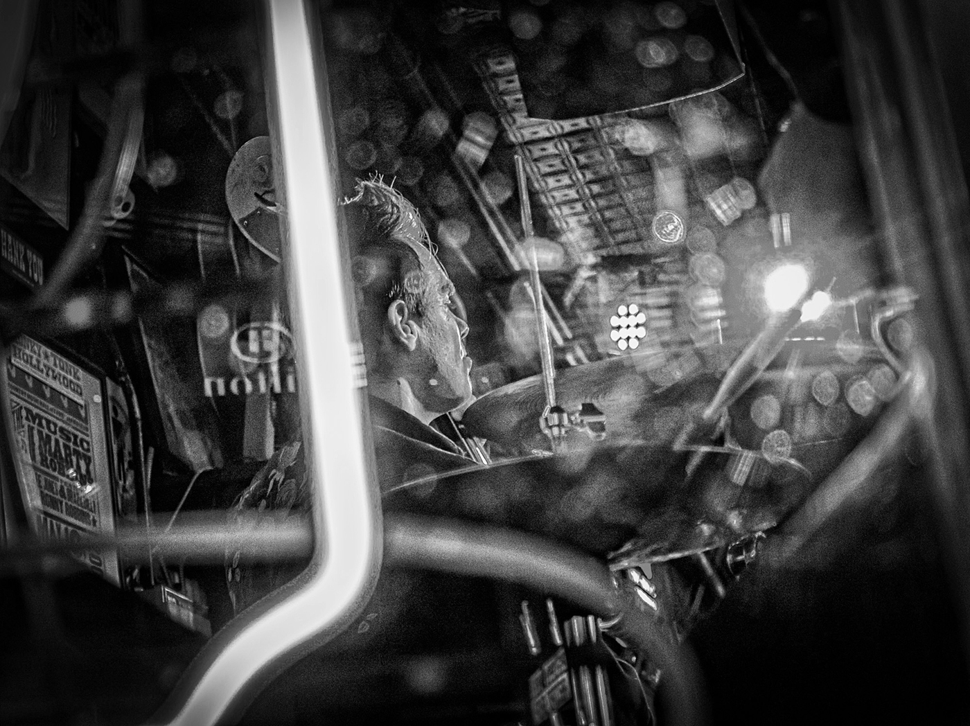 I think this is a stunning capture of a street photograph. You have everything in: poster, musician, lights, color. I can just feel the music. Congratulations on seeing and getting this. I think it also works in B/W, but the bright streak in the foreground would need to be toned down a bit. |