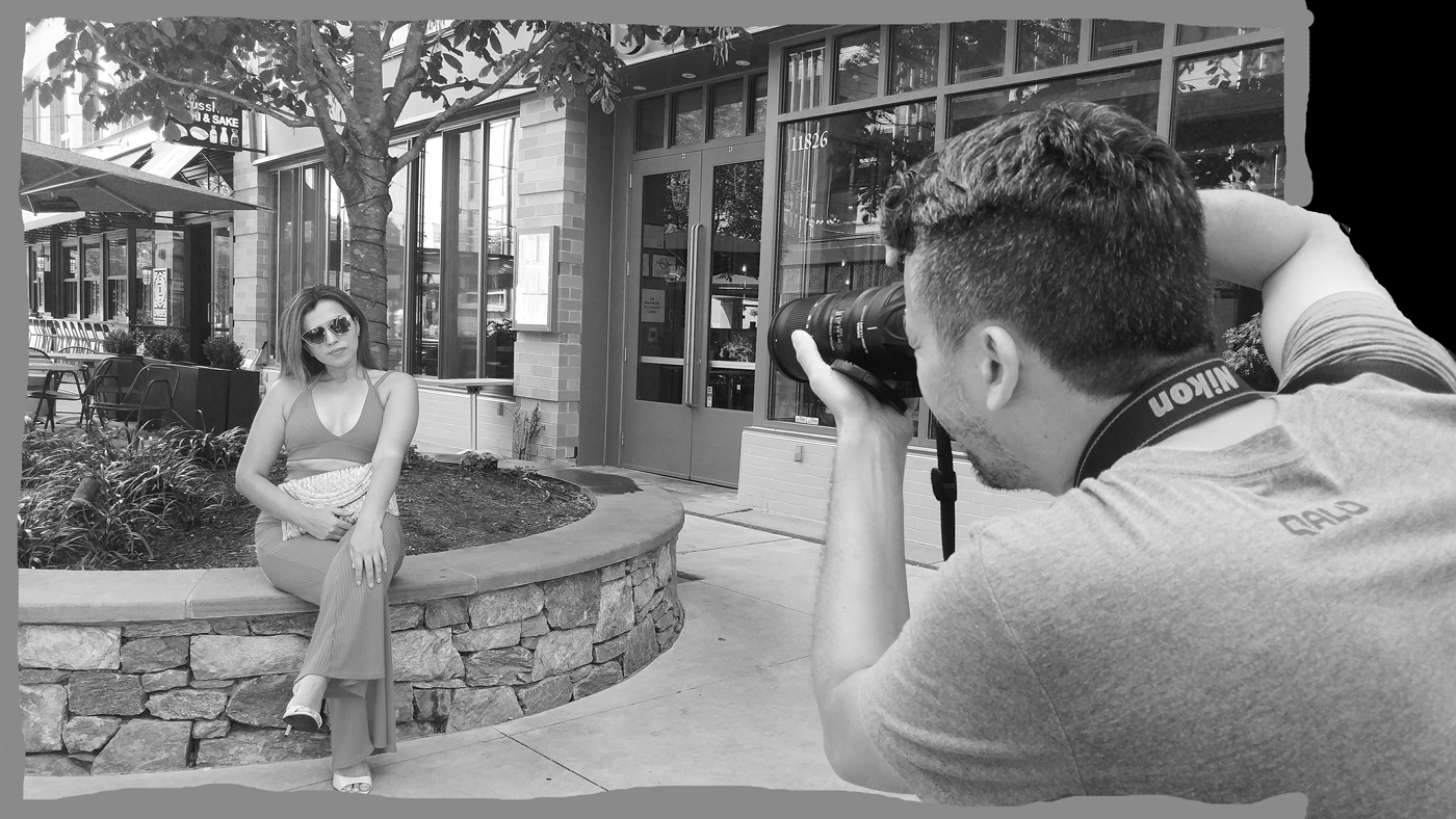 Self-criticism here. I realized afterwards that the image I chose had a better pose of the photographer, with his right arm upraised. Also, I dare to say that since he is at the edge of the frame, that he is almost "outside" the frame, shooting in. I would like to put a stroke around the frame that has the right 10% of the shot outside the right side and not continuing to frame his body, to strengthen the idea that he is both inside and outside the frame. I will need to remove the portion of the building in the 10% so only the photographer goes outside the frame. As to the model, I believe she had hired him for a publicity shot. But I think she made a serious mistake to wear sun-sensitive glasses. |