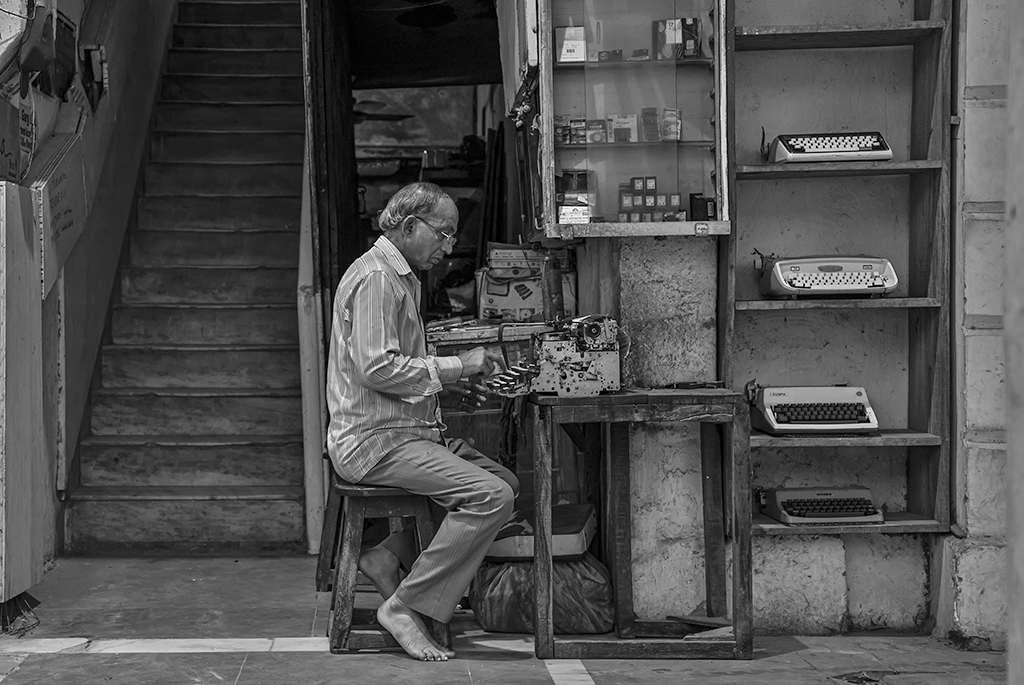 This is a fine story-portrait. I think your man is working on one of the big office manual machines I learned to type on in the late 1950s.