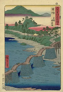 I Googled "Japan Wooden Bridge." Evidently this is the most famous wooden bridge in Japan, because I immediately found out this is the Kintai Bridge in the city of Iwakuni, in Yamaguchi Prefecture, and it has a substantial Wikipedia entry, as well as this Hiroshige print. |