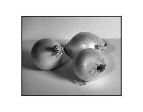 2. I think the several shadows are a bit discordant--the left onion has a strong shadow, but the two on the right have very faint shadows. Can you pull your left light further back so there is not so much difference--would that work?