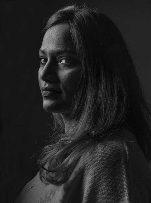 Your image is quite dark, but that gives you considerable effect with the well-setup studio lighting. The Rembrandt Triangle under her left eye is classic, and all the rest of the highlights on her face are pleasing. Her direct gaze is engaging. Her skin is not great, but I would not try to smooth it out, as I find that insincere. I think this is essentially a monochrome shot, and here is why I prefer it that way. What do you think? |
