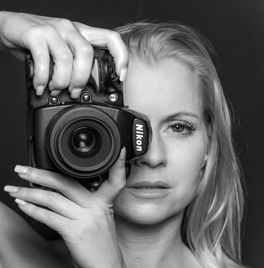 You have a lot going on here: a fine model, a prestige camera, and an interesting human/camera/eye concept. I take it from your comment and the composition itself that the main point is the human/camera/eye concept. If so, I think the model draws attention away from that because she is nude, blonde, and engaging more as a person that a photographer. I suggest cropping down to the most basic elements of the human/camera/eye composition, as attached. What do you think?