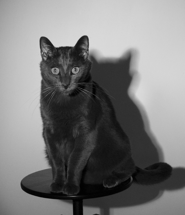 I like Tom's idea to move your cat further away from the background (white) because then the shadow would be separated from the cat. His comment about rim lighting is very sharp (the idea is sharp, but so I suppose would be the rim lighting). |