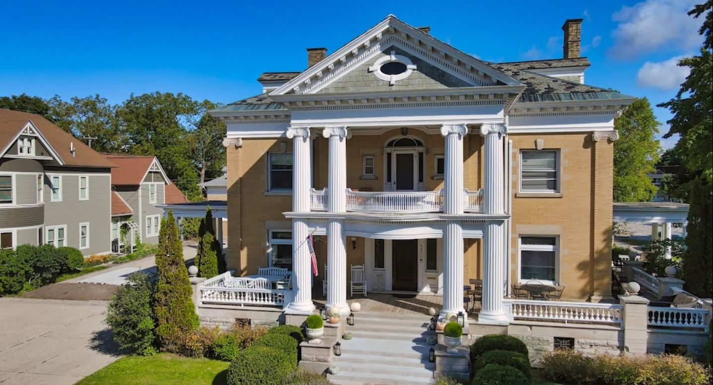 This shot is nostalgic for me because our oldest daughter got married in Michigan in a very similar repurposed private mansion, complete with a similar balcony, the Cartier Mansion in Ludington, MI. It had been built by a lumber baron, so every room was finished in a different fine wood. |