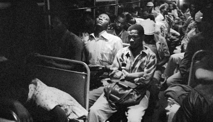 This reminds me of the work of the late South African photographer David Goldblatt, whose work focused on the subtle differences between races in South Africa--not riots and struggles, but documenting daily differences. Here is the image of his that yours reminded me of, showing the exhaustion of workers travelling long commuting distances to their menial jobs because of restrictions on where they could live. |
