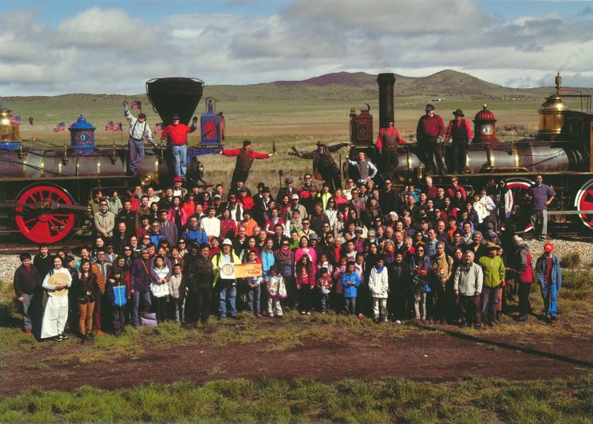 The Asian-American photographer, Corky Lee, passed away a couple of years ago. In his obit articles, one mentioned that he had photographed an Asian re-enactment of the same meeting. The original photograph had none of the Asian rail workers in it, and the re-enactment recognizes ex-post-facto that they existed and contributed huge numbers of laborers to the project. |