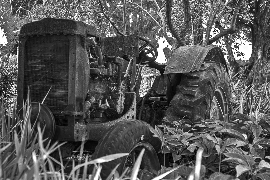 This is a good subject, but the problem is to separate the tractor from the background. I converted to monochrome using one of my PS Elements presets, then used Darken Highlights to reduce the brightness in the sky and trees, but I found that still left them fairly bright, but fortunately left the tractor still dark, separating it from the background. Then I sharpened this a bit. I am not sure if I achieved anything, but see how it looks to you. |
