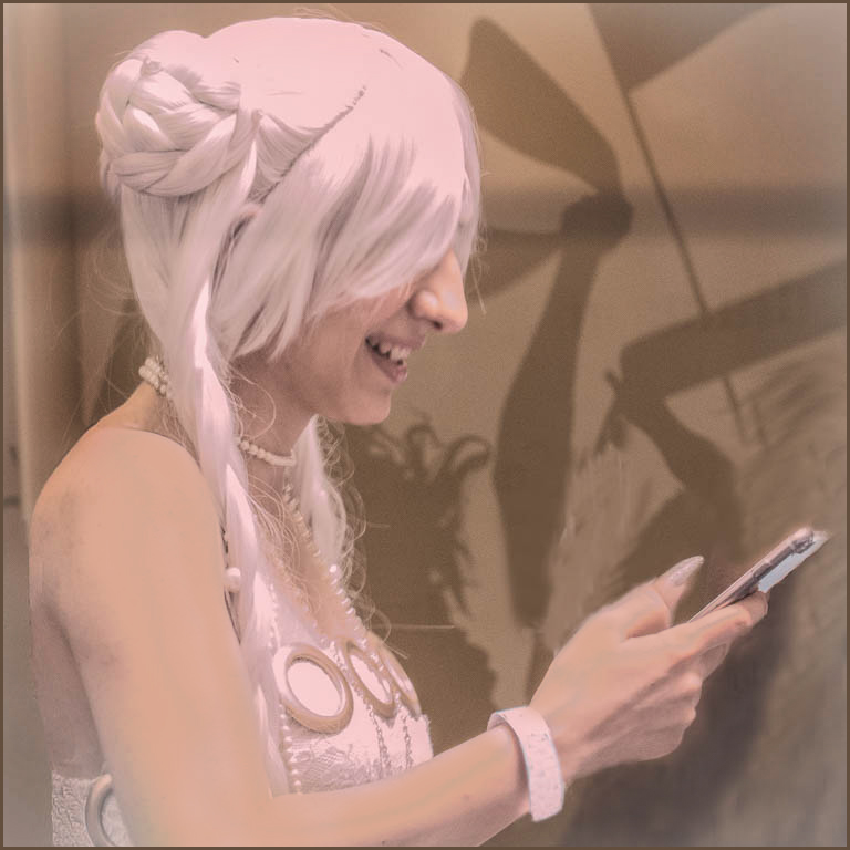 Good use of this image... I like your creation and techniques used. Maybe create a background of cell phone pics to give her character more interest. If you fix the arm and burn the left side and corners to darken, the eye will be drawn more to the face and hand holding the cell phone. Good creative image.