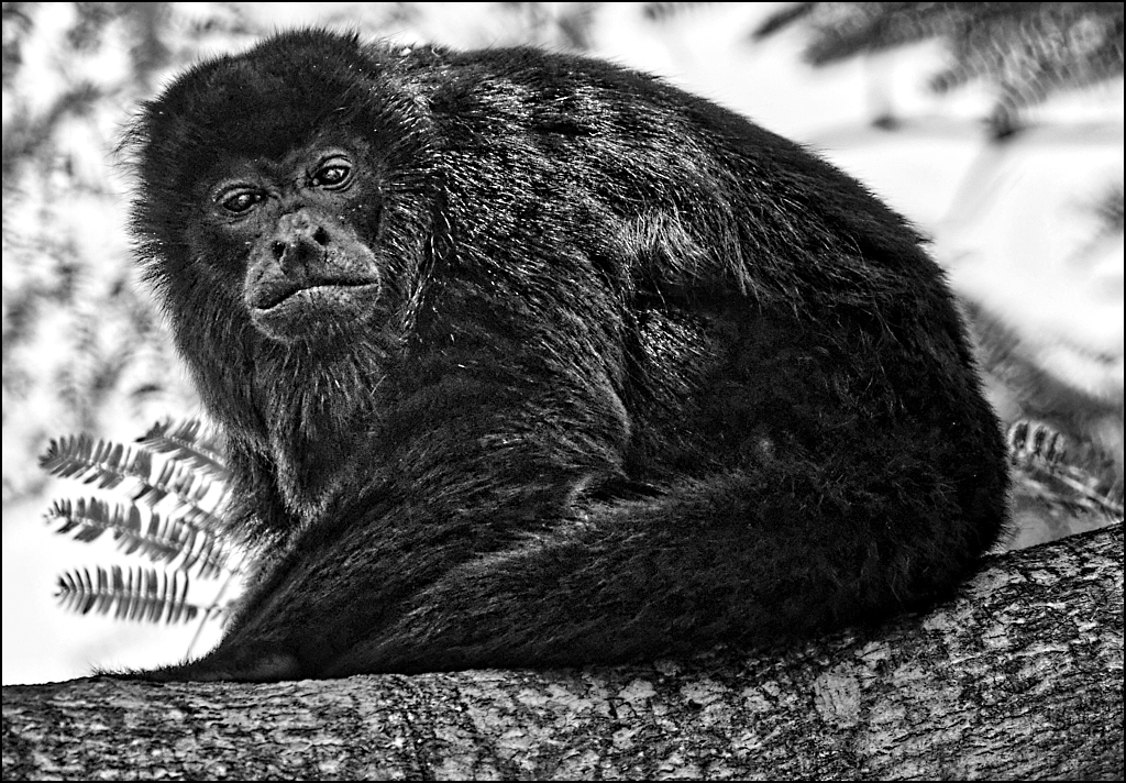 Good pic of the monkey... Why not convert to mono and work with that. Would lighten the white areas of the monkey and then use Topaz - detail - overall detail strong II to really bring out the white and face area of the monkey. Adding more impact to him, makes the background lessen in it's distraction. Very good monkey.