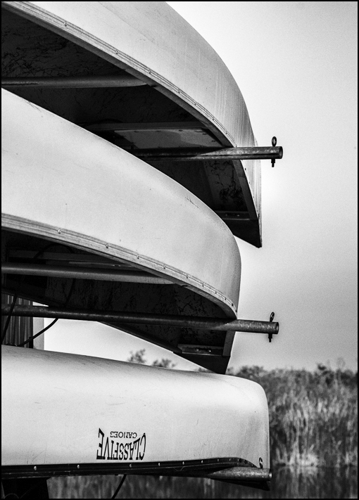 Good pic of the canoes. I wouldn't take the shadow area away from the canoes. Changing to mono was good, but you need a better center of interest than the name on the bottom canoe. I would crop the bottom. Maybe use this for a montage is a canoer. Nice pic.
