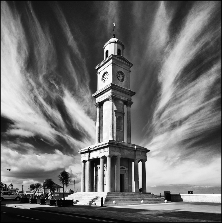 Marvelous sky and beautiful tower... I suggest adding two layers of "medium contrast" but mask out the right side of the building on both. Beautiful monochrome image.