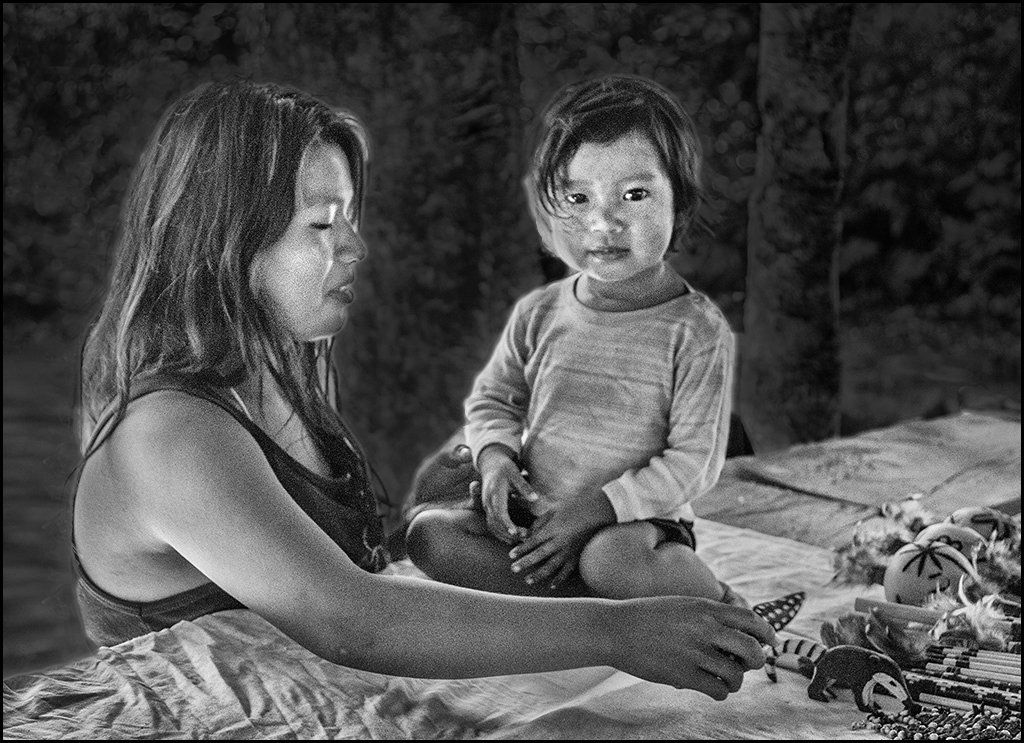 Very good child portrait with saleslady... I suggest continuing and darken your background which will emphasize the lady and child. Also lighten the lady's nose and forehead as well as the child's facial area a little more - slightly darken the lady's cheek. Did you get a shot of the child interacting with the toys ? Good work to convert to mono.