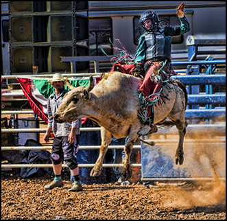 Good rodeo image... Nice idea to replace the background, but the bricks aren't a normal background you would see around a rodeo, so maybe just try for a field and sky. Otherwise, the action is good. In PJ Salon competition, you can't replace things like backgrounds - just dodge and burn. In Pictorial Salon competition, you can do anything but most of our creative images do better in a special creative competition. In PJ and Nature, you can't remove or add things that were not there when you took the pic. Also, you can't blur things in a PJ or Nature image. Thought I should mention this to new PSA members.