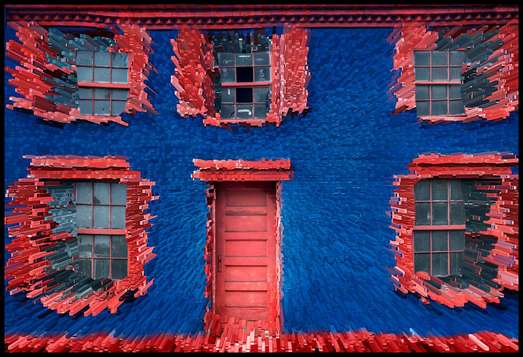 Very colorful extrude image... I have only used extrude a few times but I think that if you leave part of your image normal that makes the extrude in the image be more real. So I brough back the windows and door to normal to see if that could help your creative image - what do you think ? Especially if you use extrude on a person, it is always best to bring the face back to normal. I used it on a color indian woman's colorful beaded garmet which was very successful in salons but I make sure her face and hair was normal. Just suggestions... Good image.