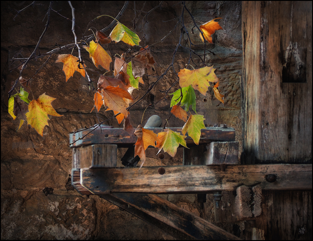Very good combination of images... Putting autumn colors into the wood grain is a nice idea but I suggest taking the time to burn the right side and the bottom to draw more attention to the leaves and light area of wood. Also use the stamp tool to remove the light vertical on the right. You did a very good job of selecting the branch and leaves. Good image.