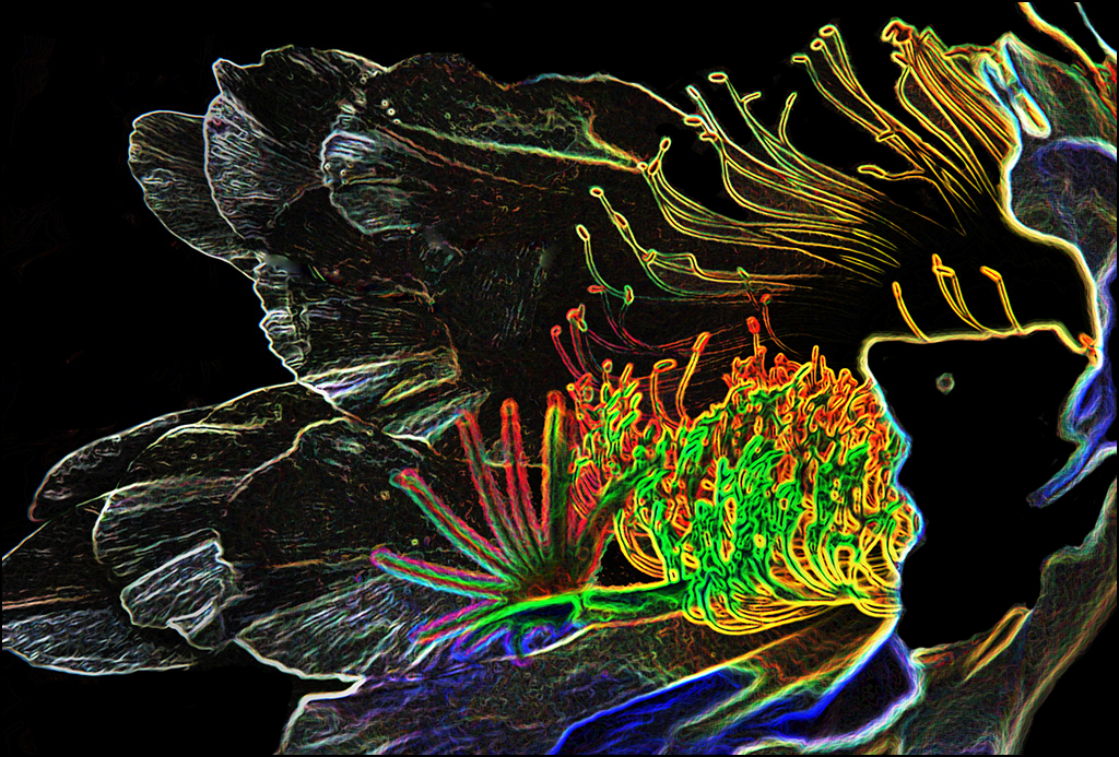 Very bright final image... Using neon edges is a challenge to end with something that resembles something familiar instead of just colorful lines. Sometimes the title will help identify the subject but removing some parts of the neon creation will help also. I suggest you use a blank layer and paint black on it to blacken area and white or another color to add some details that maybe would help your subject. I blackened some areas around your flower and around the stamens and pistols of the flower but you might have other ideas. This is a suggestion to improve your neon creation. Good job using distort and other tools to finalize your result. Great creation and job...
